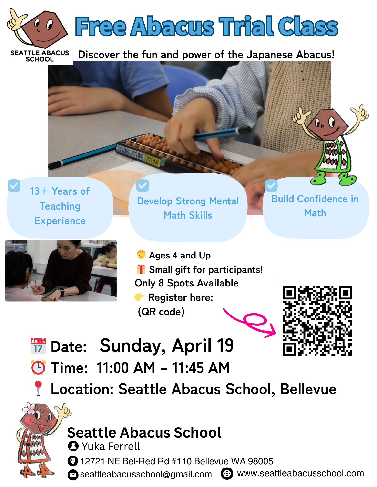At Seattle Abacus School, we provide high-quality abacus education for children of all ages and levels. Through hands-on practice and individualized guidance, students develop mental agility, concentration, and confidence—skills that last a lifetime.